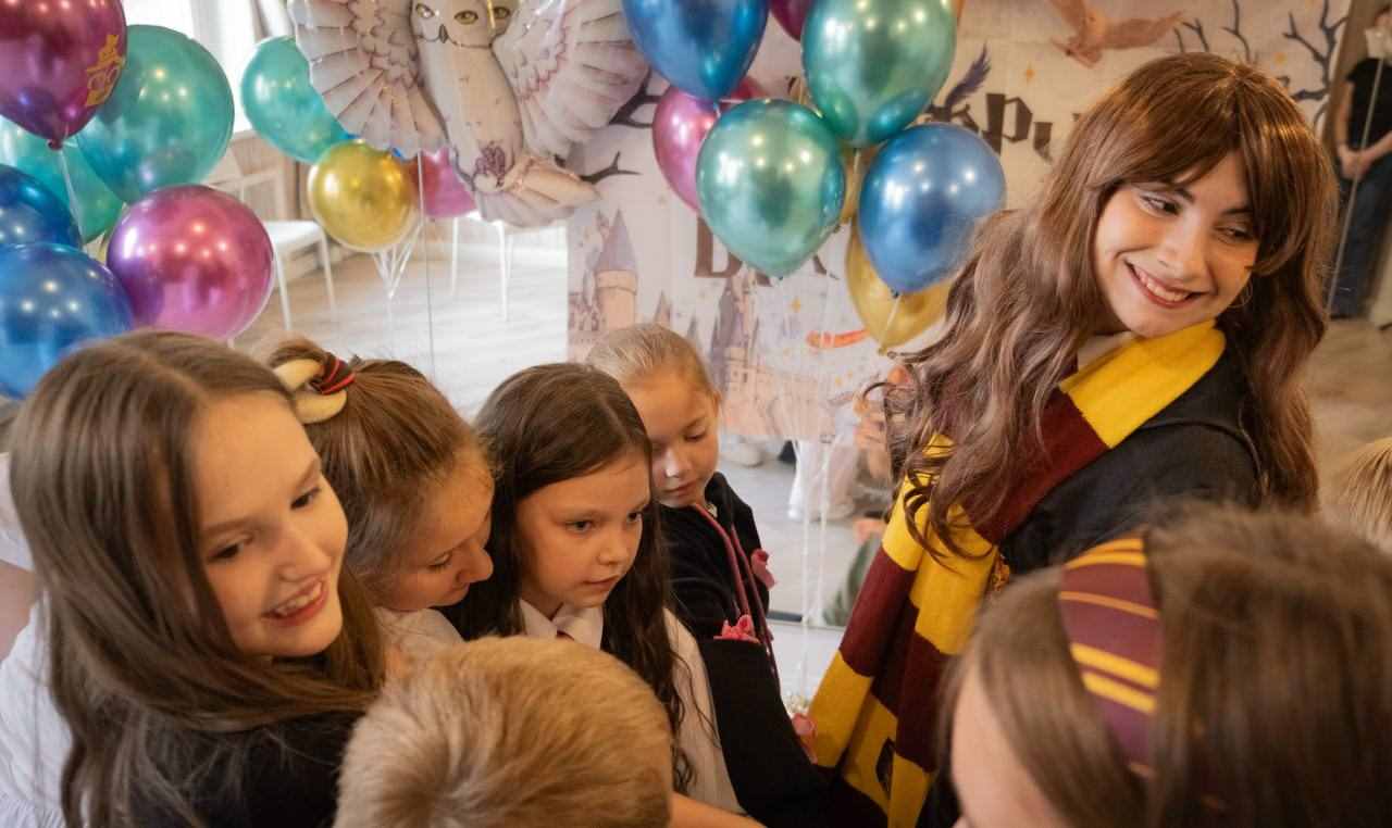 1. Приветствие: Аниматоры Гарри Поттер и Гермиона встретят гостей праздника в лучших традициях Хогвартса, создавая волшебную атмосферу с первых минут.